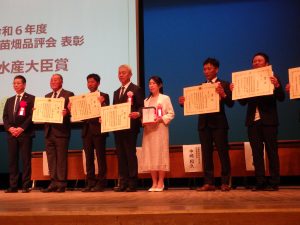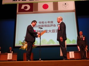 当組合の組合員であります羽太 喜久雄氏、理香氏が令和6年度全国苗畑品評会表彰において栄えある農林水産大臣賞を受賞し、さる令和7年10月9日に熊本市で開催されました「第9回全苗連生産者の集い」おいて賞が授与されました。