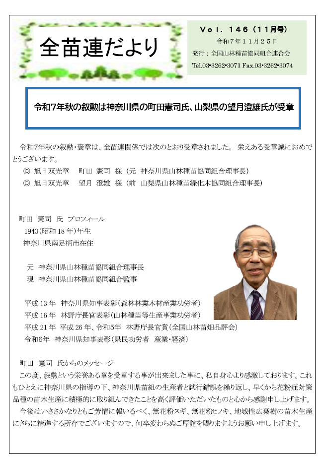 町田氏は、神奈川県の行政・試験研究機関の指導の下、組合員の生産者と試行錯誤を繰り返し、早くから花粉症対策品種の苗木生産に積極的に取組んできたことが高く評価されたものであり組合としても光栄なことです。おめでとうございます。